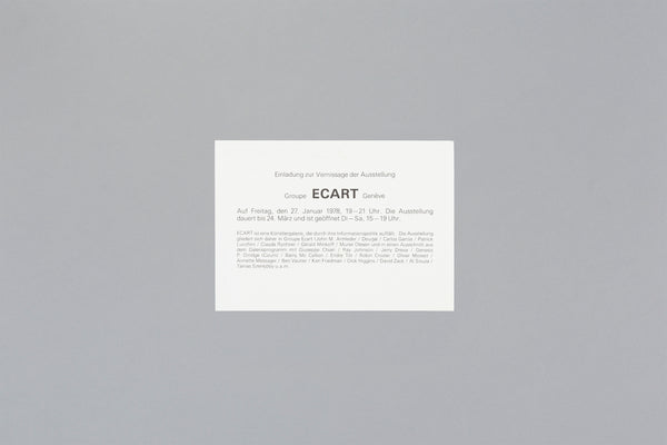 Carton d'invitation, Ecart Publications vernissage le vendredi 27 janvier dès 19h. exposition ouverte jusqu'au 24 Mars 1978. 12.5 x 17.5 cm Condition: New