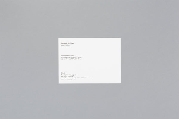 Fernando de Filippi : Substitution photographies, films vernissage en présence de l'auteur le jeudi 10 mars 1997, dès 19 h. écart 6, rue plantamour, genève Format: 10.5 x 14.8 cm. Impression offset