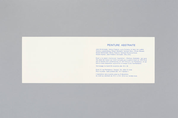 Ecart a le plaisir d'annoncer l'exposition « Peinture Abstraite » qui aura lieu dans les locaux qui furent occupés par la galerie Ecart en 1972-79 et par le Centre d'art contemporain en 1977-79 au 6, rue Plantamour, et qui sont à notre disposition aujourd'hui le temps d'une manifestation.